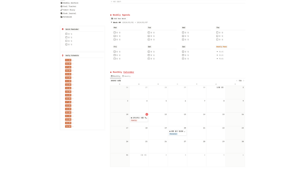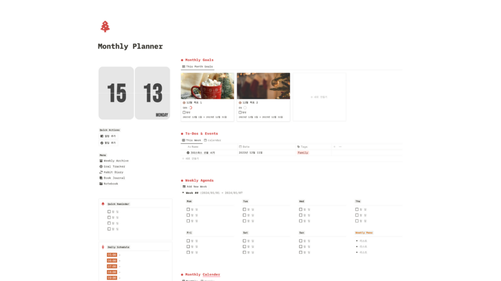 한 달, 일주일, 하루를 기록하고 계획할 수 있는 노션 먼슬리 플래너 템플릿입니다.
